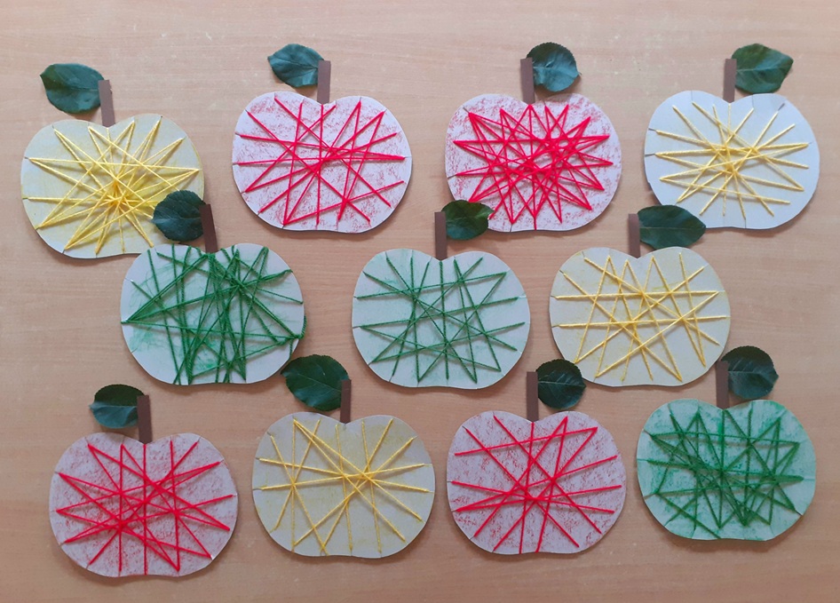 Z odpadového proklad. papíru vystřihneme tvar jablka a po jeho obvodu prostřiháme 8mm proužky na vlnu (viz foto). Vybarvíme ho voskovkou na plocho. Malými klubíčky jablko omotáváme do prostřižených drážek. Stopka je z hnědé čtvrtky a list z jabloně.