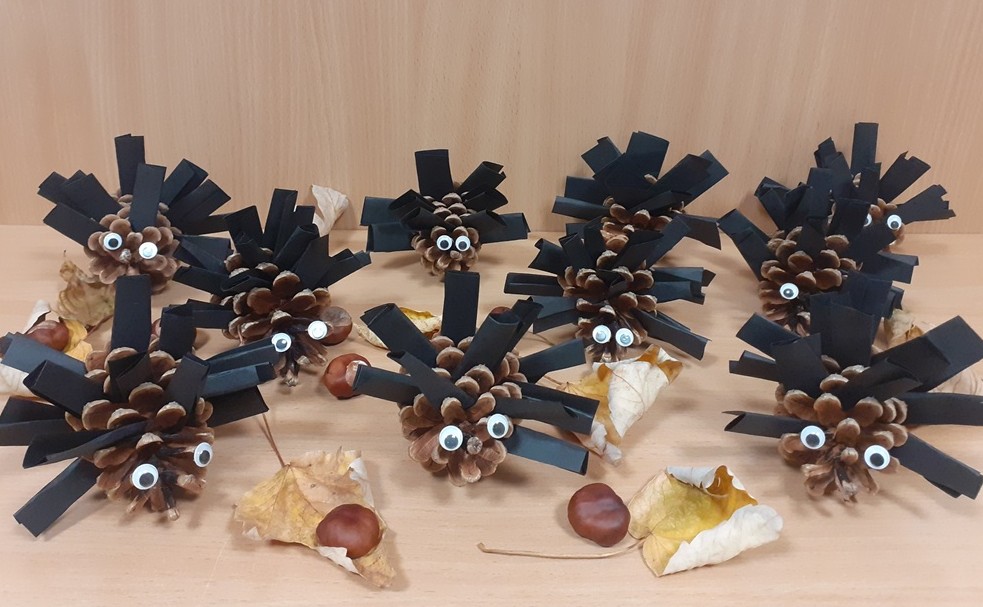 Ježek – tělo je z borovicové šišky. Bodlinky – černá čtvrtka (čtverečky 4,5 x 4,5 cm) dvakrát přehneme a vkládáme je různě do šišky (viz foto). Nakonec dolepíme pistolkou mrkací očička.