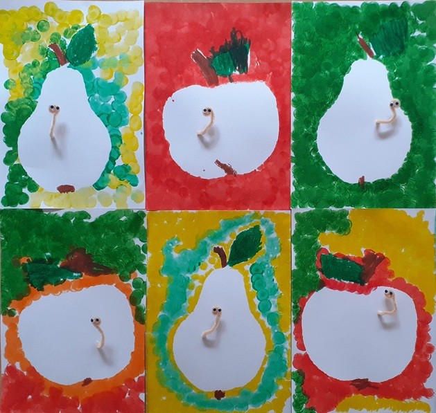 Ze čtvrtky vystřihneme tvar jablka a hrušky. Na jinou čtvrtku děti tiskají kolem vybraného tvaru molitanovým tiskátkem podzimní barvy. Po zaschnutí dokreslí stopku, bubáka a list. Nakonec pistolkou vlepíme červíka z tvarovacího drátku, kterému dolepíme malá očka.